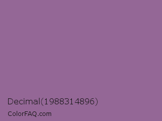 Decimal 1988314896 Color is a normal magenta color and the nearest color is Trendy Pink #8c6495. Hex code #946796 and RGB value is rgb(148,103,150). In RGB color space, this color is composed of 58% red, 40% green, 59% blue, In CMYK color space, this color is composed of 1% cyan, 31% magenta, 0% yellow , 41% black , In HSL color space, this color has a hue angle of 297° , 19% saturation and 50% lightness.