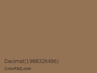 Decimal 1988326496 Color is a normal orange color and the nearest color is Liver Chestnut #987456. Hex code #947254 and RGB value is rgb(148,114,84). In RGB color space, this color is composed of 58% red, 45% green, 33% blue, In CMYK color space, this color is composed of 0% cyan, 23% magenta, 43% yellow , 42% black , In HSL color space, this color has a hue angle of 28° , 28% saturation and 45% lightness.