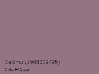 Decimal 1988329495 Color is a normal rose color and the nearest color is Bazaar #98777b. Hex code #947481 and RGB value is rgb(148,116,129). In RGB color space, this color is composed of 58% red, 45% green, 51% blue, In CMYK color space, this color is composed of 0% cyan, 22% magenta, 13% yellow , 42% black , In HSL color space, this color has a hue angle of 336° , 13% saturation and 52% lightness.