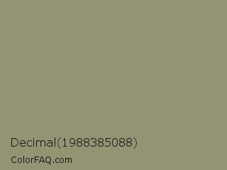 Decimal 1988385088 Color is a normal yellow color and the nearest color is Gurkha #9a9577. Hex code #949374 and RGB value is rgb(148,147,116). In RGB color space, this color is composed of 58% red, 58% green, 45% blue, In CMYK color space, this color is composed of 0% cyan, 1% magenta, 22% yellow , 42% black , In HSL color space, this color has a hue angle of 58° , 13% saturation and 52% lightness.