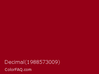 Decimal 1988573009 Color is a dark red color and the nearest color is Carmine #960018. Hex code #950017 and RGB value is rgb(149,0,23). In RGB color space, this color is composed of 58% red, 0% green, 9% blue, In CMYK color space, this color is composed of 0% cyan, 100% magenta, 85% yellow , 42% black , In HSL color space, this color has a hue angle of 351° , 100% saturation and 29% lightness.