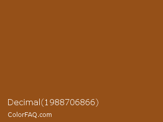 Decimal 1988706866 Color is a normal orange color and the nearest color is Rope #8e4d1e. Hex code #955018 and RGB value is rgb(149,80,24). In RGB color space, this color is composed of 58% red, 31% green, 9% blue, In CMYK color space, this color is composed of 0% cyan, 46% magenta, 84% yellow , 42% black , In HSL color space, this color has a hue angle of 27° , 72% saturation and 34% lightness.