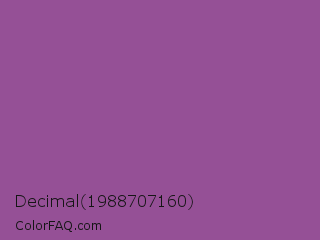 Decimal 1988707160 Color is a normal magenta color and the nearest color is Razzmic Berry #8d4e85. Hex code #955096 and RGB value is rgb(149,80,150). In RGB color space, this color is composed of 58% red, 31% green, 59% blue, In CMYK color space, this color is composed of 1% cyan, 47% magenta, 0% yellow , 41% black , In HSL color space, this color has a hue angle of 299° , 30% saturation and 45% lightness.