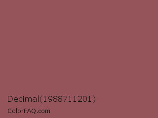 Decimal 1988711201 Color is a normal red color and the nearest color is Rose Taupe #905d5d. Hex code #955459 and RGB value is rgb(149,84,89). In RGB color space, this color is composed of 58% red, 33% green, 35% blue, In CMYK color space, this color is composed of 0% cyan, 44% magenta, 40% yellow , 42% black , In HSL color space, this color has a hue angle of 355° , 28% saturation and 46% lightness.