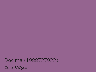 Decimal 1988727922 Color is a normal magenta color and the nearest color is Strikemaster #956387. Hex code #956490 and RGB value is rgb(149,100,144). In RGB color space, this color is composed of 58% red, 39% green, 56% blue, In CMYK color space, this color is composed of 0% cyan, 33% magenta, 3% yellow , 42% black , In HSL color space, this color has a hue angle of 306° , 20% saturation and 49% lightness.