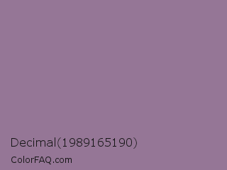 Decimal 1989165190 Color is a normal magenta color and the nearest color is Mountbatten Pink #997a8d. Hex code #957696 and RGB value is rgb(149,118,150). In RGB color space, this color is composed of 58% red, 46% green, 59% blue, In CMYK color space, this color is composed of 1% cyan, 21% magenta, 0% yellow , 41% black , In HSL color space, this color has a hue angle of 298° , 13% saturation and 53% lightness.