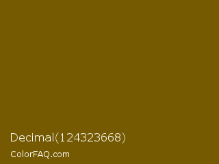 Decimal 124323668 Color is a dark yellow color and the nearest color is Yukon Gold #7b6608. Hex code #755a02 and RGB value is rgb(117,90,2). In RGB color space, this color is composed of 46% red, 35% green, 1% blue, In CMYK color space, this color is composed of 0% cyan, 23% magenta, 98% yellow , 54% black , In HSL color space, this color has a hue angle of 46° , 97% saturation and 23% lightness.