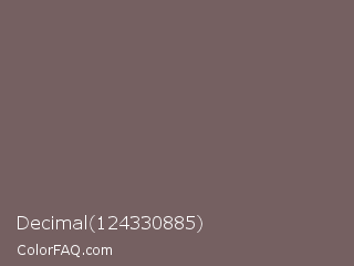 Decimal 124330885 Color is a normal red color and the nearest color is Deep Taupe #7e5e60. Hex code #756061 and RGB value is rgb(117,96,97). In RGB color space, this color is composed of 46% red, 38% green, 38% blue, In CMYK color space, this color is composed of 0% cyan, 18% magenta, 17% yellow , 54% black , In HSL color space, this color has a hue angle of 357° , 10% saturation and 42% lightness.