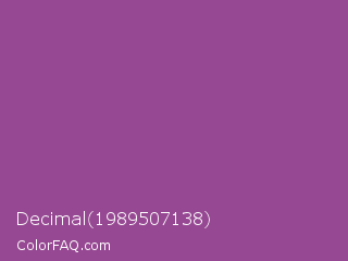 Decimal 1989507138 Color is a normal magenta color and the nearest color is Plum #8e4585. Hex code #964892 and RGB value is rgb(150,72,146). In RGB color space, this color is composed of 59% red, 28% green, 57% blue, In CMYK color space, this color is composed of 0% cyan, 52% magenta, 3% yellow , 41% black , In HSL color space, this color has a hue angle of 303° , 35% saturation and 44% lightness.