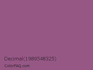 Decimal 1989548325 Color is a normal magenta color and the nearest color is Antique Fuchsia #915c83. Hex code #965885 and RGB value is rgb(150,88,133). In RGB color space, this color is composed of 59% red, 35% green, 52% blue, In CMYK color space, this color is composed of 0% cyan, 41% magenta, 11% yellow , 41% black , In HSL color space, this color has a hue angle of 316° , 26% saturation and 47% lightness.