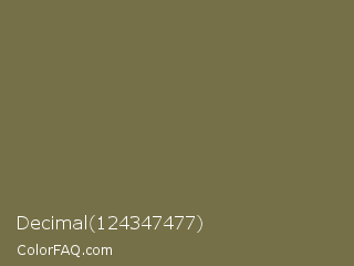 Decimal 124347477 Color is a normal yellow color and the nearest color is Go Ben #726d4e. Hex code #757047 and RGB value is rgb(117,112,71). In RGB color space, this color is composed of 46% red, 44% green, 28% blue, In CMYK color space, this color is composed of 0% cyan, 4% magenta, 39% yellow , 54% black , In HSL color space, this color has a hue angle of 53° , 24% saturation and 37% lightness.
