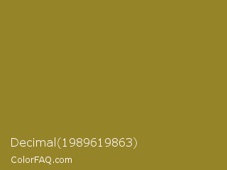 Decimal 1989619863 Color is a normal yellow color and the nearest color is Hacienda #98811b. Hex code #968429 and RGB value is rgb(150,132,41). In RGB color space, this color is composed of 59% red, 52% green, 16% blue, In CMYK color space, this color is composed of 0% cyan, 12% magenta, 73% yellow , 41% black , In HSL color space, this color has a hue angle of 50° , 57% saturation and 37% lightness.