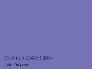 Decimal 124351285 Color is a normal indigo color and the nearest color is Toolbox #746cc0. Hex code #7573b7 and RGB value is rgb(117,115,183). In RGB color space, this color is composed of 46% red, 45% green, 72% blue, In CMYK color space, this color is composed of 36% cyan, 37% magenta, 0% yellow , 28% black , In HSL color space, this color has a hue angle of 242° , 32% saturation and 58% lightness.