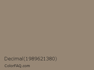 Decimal 1989621380 Color is a normal orange color and the nearest color is Arrowtown #948771. Hex code #968674 and RGB value is rgb(150,134,116). In RGB color space, this color is composed of 59% red, 53% green, 45% blue, In CMYK color space, this color is composed of 0% cyan, 11% magenta, 23% yellow , 41% black , In HSL color space, this color has a hue angle of 32° , 14% saturation and 52% lightness.