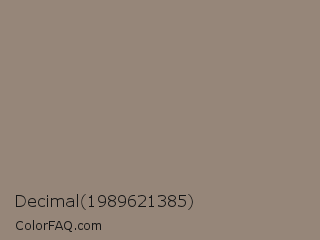 Decimal 1989621385 Color is a normal orange color and the nearest color is Cinereous #98817b. Hex code #968679 and RGB value is rgb(150,134,121). In RGB color space, this color is composed of 59% red, 53% green, 47% blue, In CMYK color space, this color is composed of 0% cyan, 11% magenta, 19% yellow , 41% black , In HSL color space, this color has a hue angle of 27° , 12% saturation and 53% lightness.