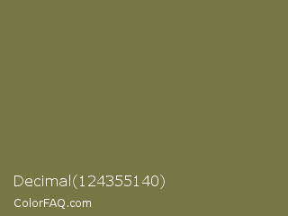 Decimal 124355140 Color is a normal yellow color and the nearest color is Go Ben #726d4e. Hex code #757744 and RGB value is rgb(117,119,68). In RGB color space, this color is composed of 46% red, 47% green, 27% blue, In CMYK color space, this color is composed of 2% cyan, 0% magenta, 43% yellow , 53% black , In HSL color space, this color has a hue angle of 62° , 27% saturation and 37% lightness.
