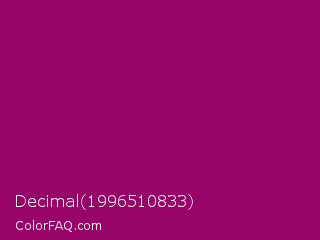 Decimal 1996510833 Color is a dark magenta color and the nearest color is Fresh Eggplant #990066. Hex code #970367 and RGB value is rgb(151,3,103). In RGB color space, this color is composed of 59% red, 1% green, 40% blue, In CMYK color space, this color is composed of 0% cyan, 98% magenta, 32% yellow , 41% black , In HSL color space, this color has a hue angle of 319° , 96% saturation and 30% lightness.
