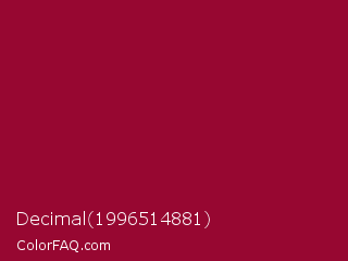 Decimal 1996514881 Color is a normal rose color and the nearest color is Pink Raspberry #980036. Hex code #970731 and RGB value is rgb(151,7,49). In RGB color space, this color is composed of 59% red, 3% green, 19% blue, In CMYK color space, this color is composed of 0% cyan, 95% magenta, 68% yellow , 41% black , In HSL color space, this color has a hue angle of 343° , 91% saturation and 31% lightness.