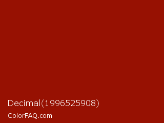 Decimal 1996525908 Color is a dark red color and the nearest color is Totem Pole #991b07. Hex code #971102 and RGB value is rgb(151,17,2). In RGB color space, this color is composed of 59% red, 7% green, 1% blue, In CMYK color space, this color is composed of 0% cyan, 89% magenta, 99% yellow , 41% black , In HSL color space, this color has a hue angle of 6° , 97% saturation and 30% lightness.