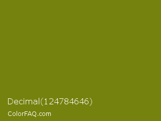 Decimal 124784646 Color is a dark yellow color and the nearest color is Trendy Green #7c881a. Hex code #75820e and RGB value is rgb(117,130,14). In RGB color space, this color is composed of 46% red, 51% green, 5% blue, In CMYK color space, this color is composed of 10% cyan, 0% magenta, 89% yellow , 49% black , In HSL color space, this color has a hue angle of 67° , 81% saturation and 28% lightness.