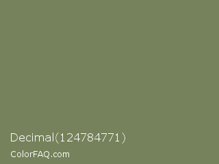 Decimal 124784771 Color is a normal green color and the nearest color is Limed Ash #747d63. Hex code #75825b and RGB value is rgb(117,130,91). In RGB color space, this color is composed of 46% red, 51% green, 36% blue, In CMYK color space, this color is composed of 10% cyan, 0% magenta, 30% yellow , 49% black , In HSL color space, this color has a hue angle of 80° , 18% saturation and 43% lightness.