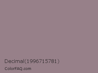 Decimal 1996715781 Color is a normal rose color and the nearest color is Mountbatten Pink #997a8d. Hex code #978089 and RGB value is rgb(151,128,137). In RGB color space, this color is composed of 59% red, 50% green, 54% blue, In CMYK color space, this color is composed of 0% cyan, 15% magenta, 9% yellow , 41% black , In HSL color space, this color has a hue angle of 337° , 10% saturation and 55% lightness.