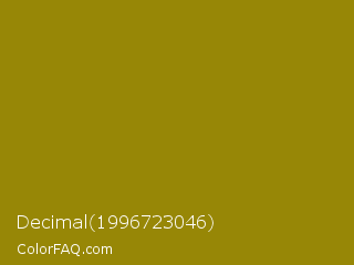 Decimal 1996723046 Color is a normal yellow color and the nearest color is Dark Yellow #9b870c. Hex code #978706 and RGB value is rgb(151,135,6). In RGB color space, this color is composed of 59% red, 53% green, 2% blue, In CMYK color space, this color is composed of 0% cyan, 11% magenta, 96% yellow , 41% black , In HSL color space, this color has a hue angle of 53° , 92% saturation and 31% lightness.