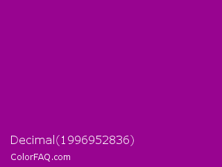 Decimal 1996952836 Color is a normal magenta color and the nearest color is Dark Magenta #8b008b. Hex code #980490 and RGB value is rgb(152,4,144). In RGB color space, this color is composed of 60% red, 2% green, 56% blue, In CMYK color space, this color is composed of 0% cyan, 97% magenta, 5% yellow , 40% black , In HSL color space, this color has a hue angle of 303° , 95% saturation and 31% lightness.