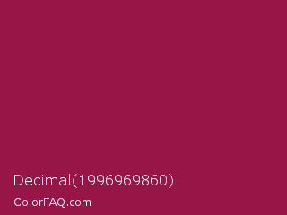 Decimal 1996969860 Color is a normal rose color and the nearest color is Big Dip O Ruby #9c2542. Hex code #981548 and RGB value is rgb(152,21,72). In RGB color space, this color is composed of 60% red, 8% green, 28% blue, In CMYK color space, this color is composed of 0% cyan, 86% magenta, 53% yellow , 40% black , In HSL color space, this color has a hue angle of 337° , 76% saturation and 34% lightness.
