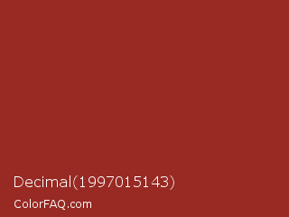 Decimal 1997015143 Color is a normal red color and the nearest color is Vivid Auburn #922724. Hex code #982923 and RGB value is rgb(152,41,35). In RGB color space, this color is composed of 60% red, 16% green, 14% blue, In CMYK color space, this color is composed of 0% cyan, 73% magenta, 77% yellow , 40% black , In HSL color space, this color has a hue angle of 3° , 63% saturation and 37% lightness.