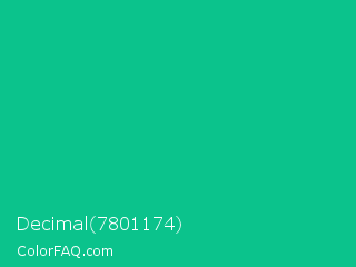 Decimal 7801174 Color is a normal green color and the nearest color is Caribbean Green #00cc99. Hex code #0bc38c and RGB value is rgb(11,195,140). In RGB color space, this color is composed of 4% red, 76% green, 55% blue, In CMYK color space, this color is composed of 94% cyan, 0% magenta, 28% yellow , 24% black , In HSL color space, this color has a hue angle of 162° , 89% saturation and 40% lightness.
