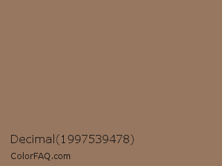 Decimal 1997539478 Color is a normal orange color and the nearest color is Toast #9a6e61. Hex code #987760 and RGB value is rgb(152,119,96). In RGB color space, this color is composed of 60% red, 47% green, 38% blue, In CMYK color space, this color is composed of 0% cyan, 22% magenta, 37% yellow , 40% black , In HSL color space, this color has a hue angle of 25° , 23% saturation and 49% lightness.