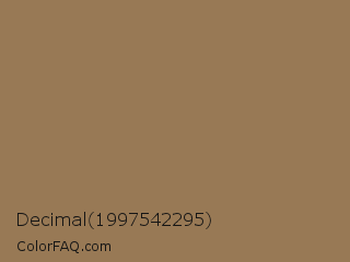 Decimal 1997542295 Color is a normal orange color and the nearest color is Pale Brown #987654. Hex code #987955 and RGB value is rgb(152,121,85). In RGB color space, this color is composed of 60% red, 47% green, 33% blue, In CMYK color space, this color is composed of 0% cyan, 20% magenta, 44% yellow , 40% black , In HSL color space, this color has a hue angle of 32° , 28% saturation and 46% lightness.