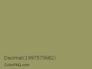 Decimal 1997575682 Color is a normal yellow color and the nearest color is Moss Green #8a9a5b. Hex code #989962 and RGB value is rgb(152,153,98). In RGB color space, this color is composed of 60% red, 60% green, 38% blue, In CMYK color space, this color is composed of 1% cyan, 0% magenta, 36% yellow , 40% black , In HSL color space, this color has a hue angle of 61° , 22% saturation and 49% lightness.