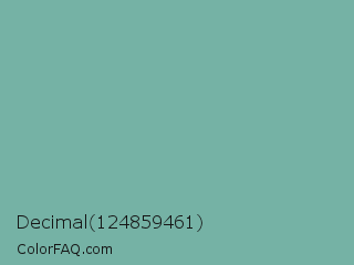 Decimal 124859461 Color is a normal cyan color and the nearest color is Acapulco #7cb0a1. Hex code #75b2a5 and RGB value is rgb(117,178,165). In RGB color space, this color is composed of 46% red, 70% green, 65% blue, In CMYK color space, this color is composed of 34% cyan, 0% magenta, 7% yellow , 30% black , In HSL color space, this color has a hue angle of 167° , 28% saturation and 58% lightness.