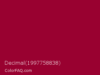 Decimal 1997758838 Color is a dark rose color and the nearest color is Pink Raspberry #980036. Hex code #990130 and RGB value is rgb(153,1,48). In RGB color space, this color is composed of 60% red, 0% green, 19% blue, In CMYK color space, this color is composed of 0% cyan, 99% magenta, 69% yellow , 40% black , In HSL color space, this color has a hue angle of 341° , 99% saturation and 30% lightness.