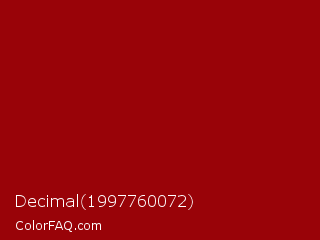 Decimal 1997760072 Color is a normal red color and the nearest color is Sangria #92000a. Hex code #990308 and RGB value is rgb(153,3,8). In RGB color space, this color is composed of 60% red, 1% green, 3% blue, In CMYK color space, this color is composed of 0% cyan, 98% magenta, 95% yellow , 40% black , In HSL color space, this color has a hue angle of 358° , 96% saturation and 31% lightness.
