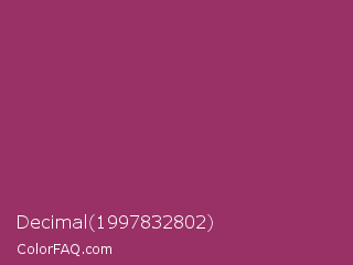 Decimal 1997832802 Color is a normal rose color and the nearest color is Amaranth Deep Purple #9f2b68. Hex code #993066 and RGB value is rgb(153,48,102). In RGB color space, this color is composed of 60% red, 19% green, 40% blue, In CMYK color space, this color is composed of 0% cyan, 69% magenta, 33% yellow , 40% black , In HSL color space, this color has a hue angle of 329° , 52% saturation and 39% lightness.