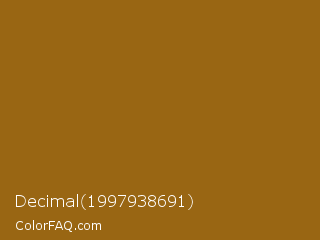 Decimal 1997938691 Color is a normal orange color and the nearest color is Golden Brown #996515. Hex code #996613 and RGB value is rgb(153,102,19). In RGB color space, this color is composed of 60% red, 40% green, 7% blue, In CMYK color space, this color is composed of 0% cyan, 33% magenta, 88% yellow , 40% black , In HSL color space, this color has a hue angle of 37° , 78% saturation and 34% lightness.