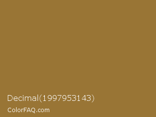 Decimal 1997953143 Color is a normal orange color and the nearest color is Metallic Sunburst #9c7c38. Hex code #997535 and RGB value is rgb(153,117,53). In RGB color space, this color is composed of 60% red, 46% green, 21% blue, In CMYK color space, this color is composed of 0% cyan, 24% magenta, 65% yellow , 40% black , In HSL color space, this color has a hue angle of 38° , 49% saturation and 40% lightness.