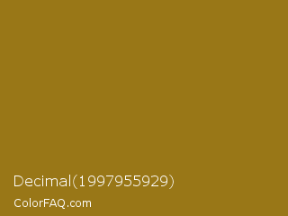 Decimal 1997955929 Color is a normal orange color and the nearest color is Sand Dune #967117. Hex code #997717 and RGB value is rgb(153,119,23). In RGB color space, this color is composed of 60% red, 47% green, 9% blue, In CMYK color space, this color is composed of 0% cyan, 22% magenta, 85% yellow , 40% black , In HSL color space, this color has a hue angle of 44° , 74% saturation and 35% lightness.
