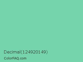 Decimal 124920149 Color is a light green color and the nearest color is Medium Aquamarine #66ddaa. Hex code #75d4ab and RGB value is rgb(117,212,171). In RGB color space, this color is composed of 46% red, 83% green, 67% blue, In CMYK color space, this color is composed of 45% cyan, 0% magenta, 19% yellow , 17% black , In HSL color space, this color has a hue angle of 154° , 52% saturation and 65% lightness.