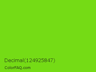 Decimal 124925847 Color is a normal green color and the nearest color is Alien Armpit #84de02. Hex code #75db15 and RGB value is rgb(117,219,21). In RGB color space, this color is composed of 46% red, 86% green, 8% blue, In CMYK color space, this color is composed of 47% cyan, 0% magenta, 90% yellow , 14% black , In HSL color space, this color has a hue angle of 91° , 83% saturation and 47% lightness.