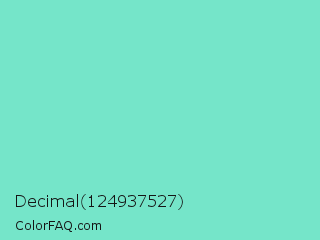 Decimal 124937527 Color is a light cyan color and the nearest color is Bermuda #7dd8c6. Hex code #75e5c9 and RGB value is rgb(117,229,201). In RGB color space, this color is composed of 46% red, 90% green, 79% blue, In CMYK color space, this color is composed of 49% cyan, 0% magenta, 12% yellow , 10% black , In HSL color space, this color has a hue angle of 165° , 68% saturation and 68% lightness.