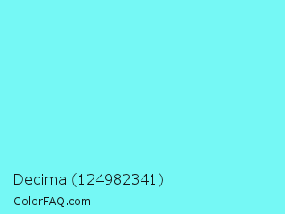 Decimal 124982341 Color is a light cyan color and the nearest color is Electric Blue #7df9ff. Hex code #75f8f5 and RGB value is rgb(117,248,245). In RGB color space, this color is composed of 46% red, 97% green, 96% blue, In CMYK color space, this color is composed of 53% cyan, 0% magenta, 1% yellow , 3% black , In HSL color space, this color has a hue angle of 179° , 90% saturation and 72% lightness.