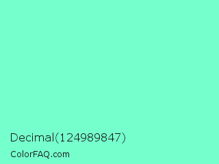 Decimal 124989847 Color is a light green color and the nearest color is Aquamarine #7fffd4. Hex code #75ffcd and RGB value is rgb(117,255,205). In RGB color space, this color is composed of 46% red, 100% green, 80% blue, In CMYK color space, this color is composed of 54% cyan, 0% magenta, 20% yellow , 0% black , In HSL color space, this color has a hue angle of 158° , 100% saturation and 73% lightness.