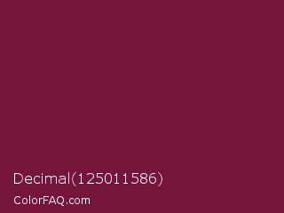 Decimal 125011586 Color is a dark rose color and the nearest color is Claret #7f1734. Hex code #76153a and RGB value is rgb(118,21,58). In RGB color space, this color is composed of 46% red, 8% green, 23% blue, In CMYK color space, this color is composed of 0% cyan, 82% magenta, 51% yellow , 54% black , In HSL color space, this color has a hue angle of 337° , 70% saturation and 27% lightness.
