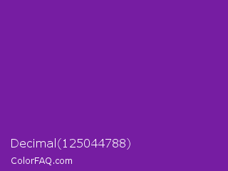 Decimal 125044788 Color is a normal purple color and the nearest color is Grape #6f2da8. Hex code #761da2 and RGB value is rgb(118,29,162). In RGB color space, this color is composed of 46% red, 11% green, 64% blue, In CMYK color space, this color is composed of 27% cyan, 82% magenta, 0% yellow , 36% black , In HSL color space, this color has a hue angle of 280° , 70% saturation and 37% lightness.