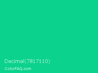 Decimal 7817110 Color is a normal green color and the nearest color is Caribbean Green #00cc99. Hex code #0bd28c and RGB value is rgb(11,210,140). In RGB color space, this color is composed of 4% red, 82% green, 55% blue, In CMYK color space, this color is composed of 95% cyan, 0% magenta, 33% yellow , 18% black , In HSL color space, this color has a hue angle of 159° , 90% saturation and 43% lightness.