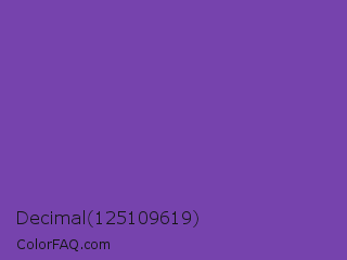Decimal 125109619 Color is a normal violet color and the nearest color is Studio #714ab2. Hex code #7643ad and RGB value is rgb(118,67,173). In RGB color space, this color is composed of 46% red, 26% green, 68% blue, In CMYK color space, this color is composed of 32% cyan, 61% magenta, 0% yellow , 32% black , In HSL color space, this color has a hue angle of 269° , 44% saturation and 47% lightness.